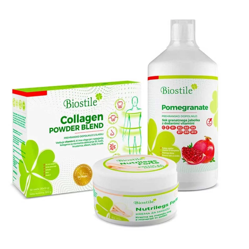 Biostile Collagen powder blend u prahu sadrži hidrolizirani kolagen iz pet različitih izvora, vitamin C, prirodni kurkumin iz kurkume i silicij iz mladih izdanaka bambusa i planinske smole shilajit. Sadrži vitamin C koji igra ulogu u stvaranju kolagena za normalno funkcioniranje krvnih žila, kostiju, hrskavice, desni, kože i zuba.